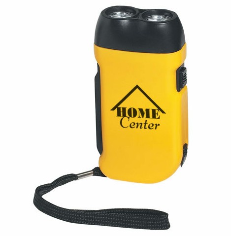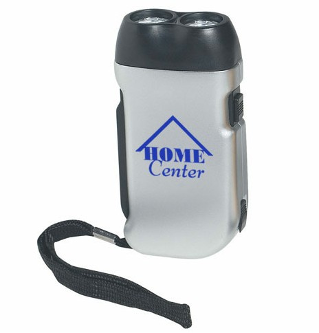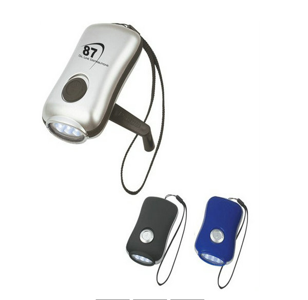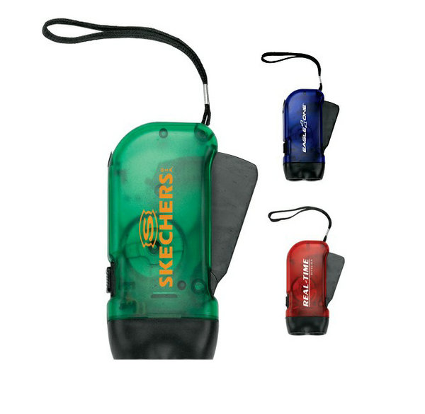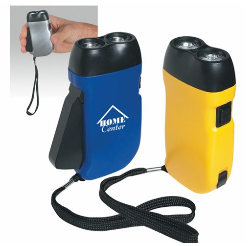 A bright and eco-friendly promotional LED flashlight that recharges by squeezing the charge handle. Never needs batteries!