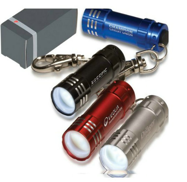 Aluminum logo flashlight is a perfect size to store just about anywhere. Promotional keychain features: