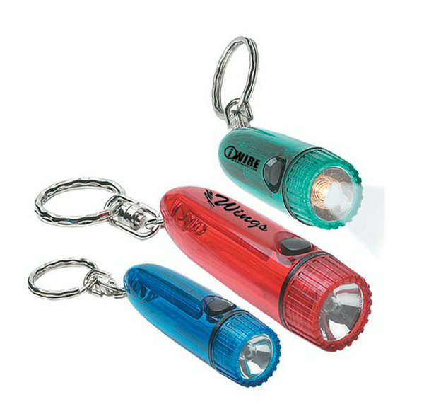 Custom keychains feature intermittent push button switch and swivel key chain attachment.