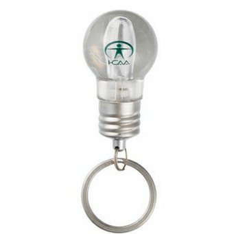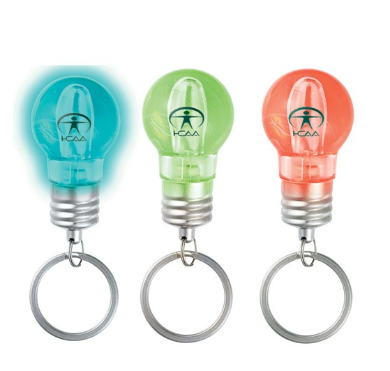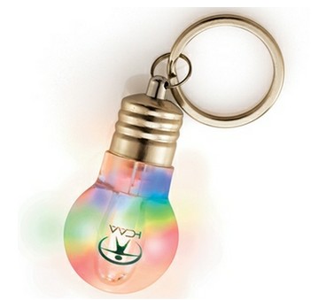 Have a brilliant moment anywhere with this light-up promotional keychain. Main of ABS Plastic, keychain lights up in three different colors (blue, red, green) which gradually change and then blink. Uses long-lasting L.E.D.s. Includes three button cell batteries.