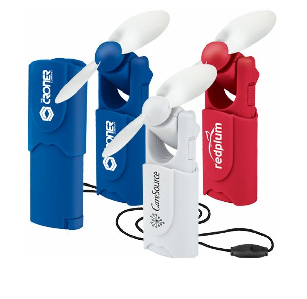 This quality hand fan features a high speed micro-motor which really moves the air. Small size Portable Promotional Personal Fan for easy pocket storage, and EVA rubber blades for complete child safety. This fan "blows away" its competition. Two AA batteries are available for an additional fee.