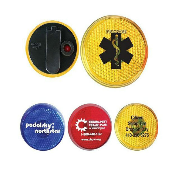 Promo button with blinking light will make your logo shine. The printed blinking button features: